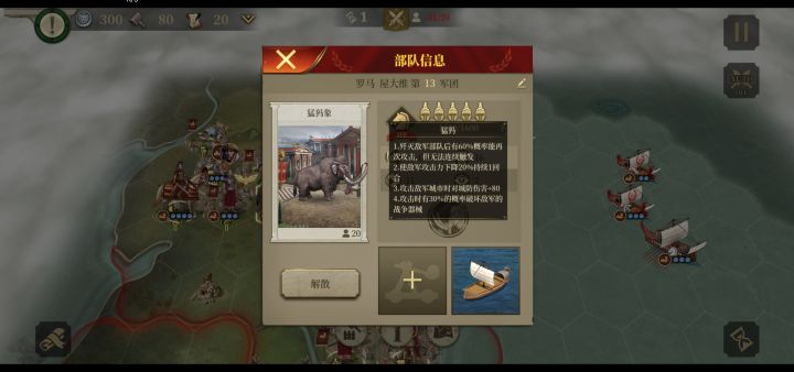感觉打英雄传奇主要问题在于一些关卡固有的将领没有,后来第二章的几个关卡只能用一个将打,就挺难的。 猛犸象好强啊,主要是带宝石的将领用一回合的行动就能在周围召唤出来(当然在一局里只能召唤一次),猛犸象还有减伤,对城伤害和连击,血也很厚。 哥布林就要差点了,不过还算不错,瘟疫一回合只能减十几滴血,聊胜于无,15的行动力也算还可以。别的特性好像也就那样,毕竟攻防都不如猛犸象。 那个汉尼拔旗子出了,同种情况下输出比阿提拉还高点,但因为没有续航,腿还短,单用他打英雄传奇经常打着打着就没了。