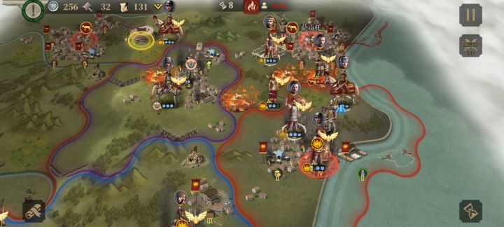 5.希腊小亚细亚则比较麻烦,由于是东亚国家大本营,很多中高级兵,好在编队小,在大汉的羽林铁骑下全部木大,步弓将专注帮队友破城就行了,最终与汉尼拔阿米在高加索会师,此时大概是45回合左右😪