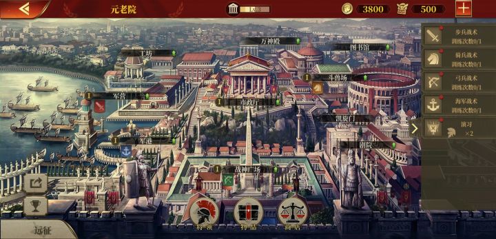 本局选的是最弱小国家,没有用任何武将或者计策(其实是第三天玩穷买不起)就是用最低的配置征服通关的,下面是个人玩法介绍一下:兵种,统一只用一种靶场里面最高级的射手(远程兵种),射手最大的优势是打别人无法反击别人打自己还可以反击不用担心血量减少,几个射手在一起直接不掉一点血的秒人,建筑,统一建四种:铸币厂跟剧院是每个城池必备的可增加收入,靶场跟采石场看个人情况而定一个出兵的一个是造兵跟建设需要的