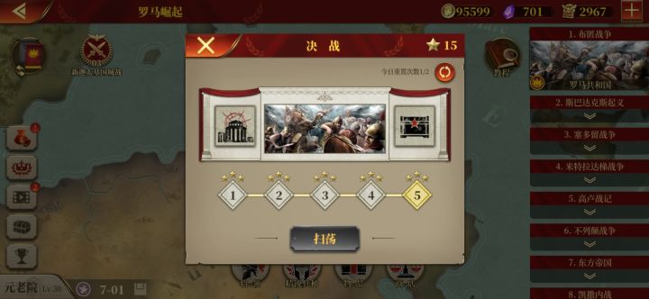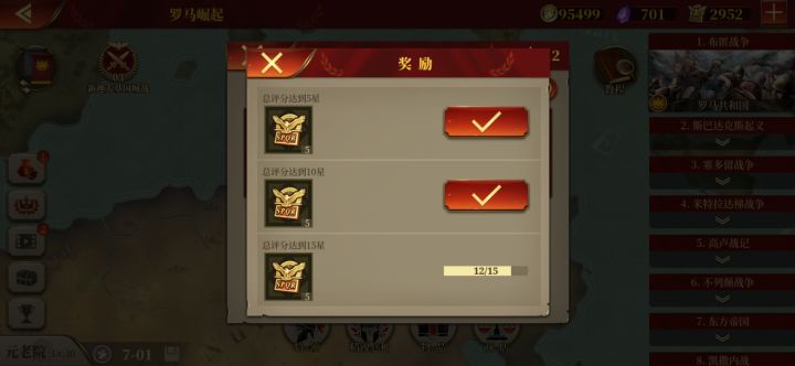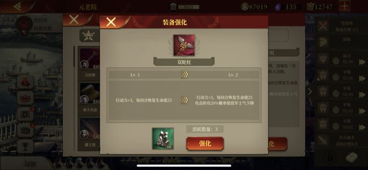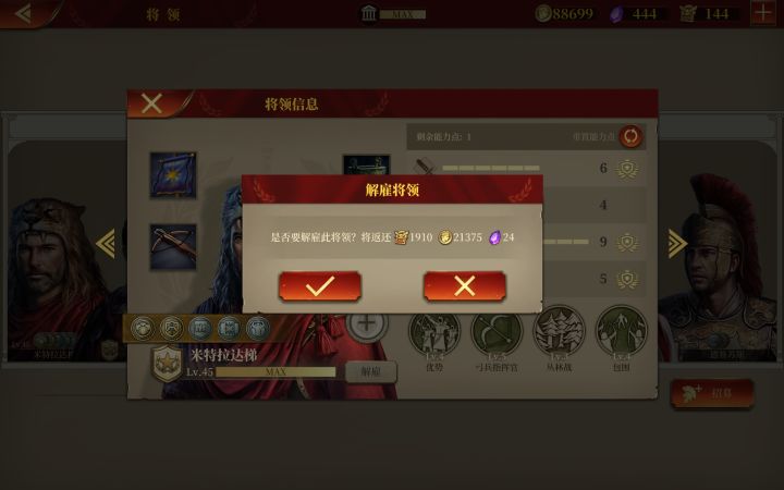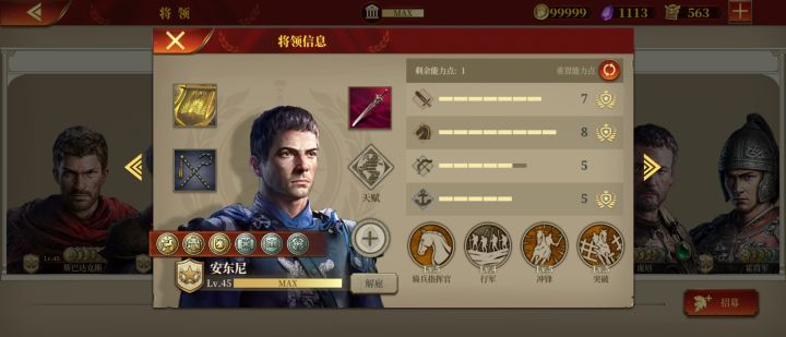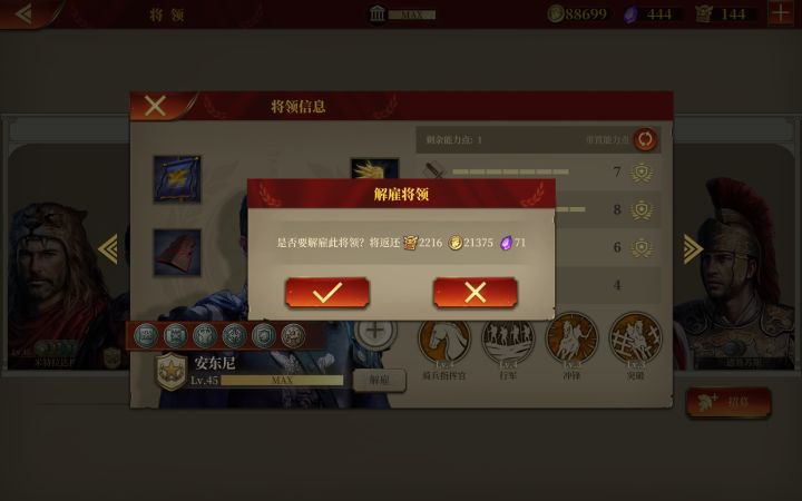 兵种增强,韩信顺带的增强了,想转弓指要多少勋章,解雇哪两个比较划算,只有十四将领,还要留人打竞技场,通关。史诗还剩三关,传奇打到牛头人宝石那关没打。还有六级兵能升几个,我升了韩信虎贲汉尼拔泥头车贝利战车兵和标枪兵,指挥官兵种的只能到五级。
