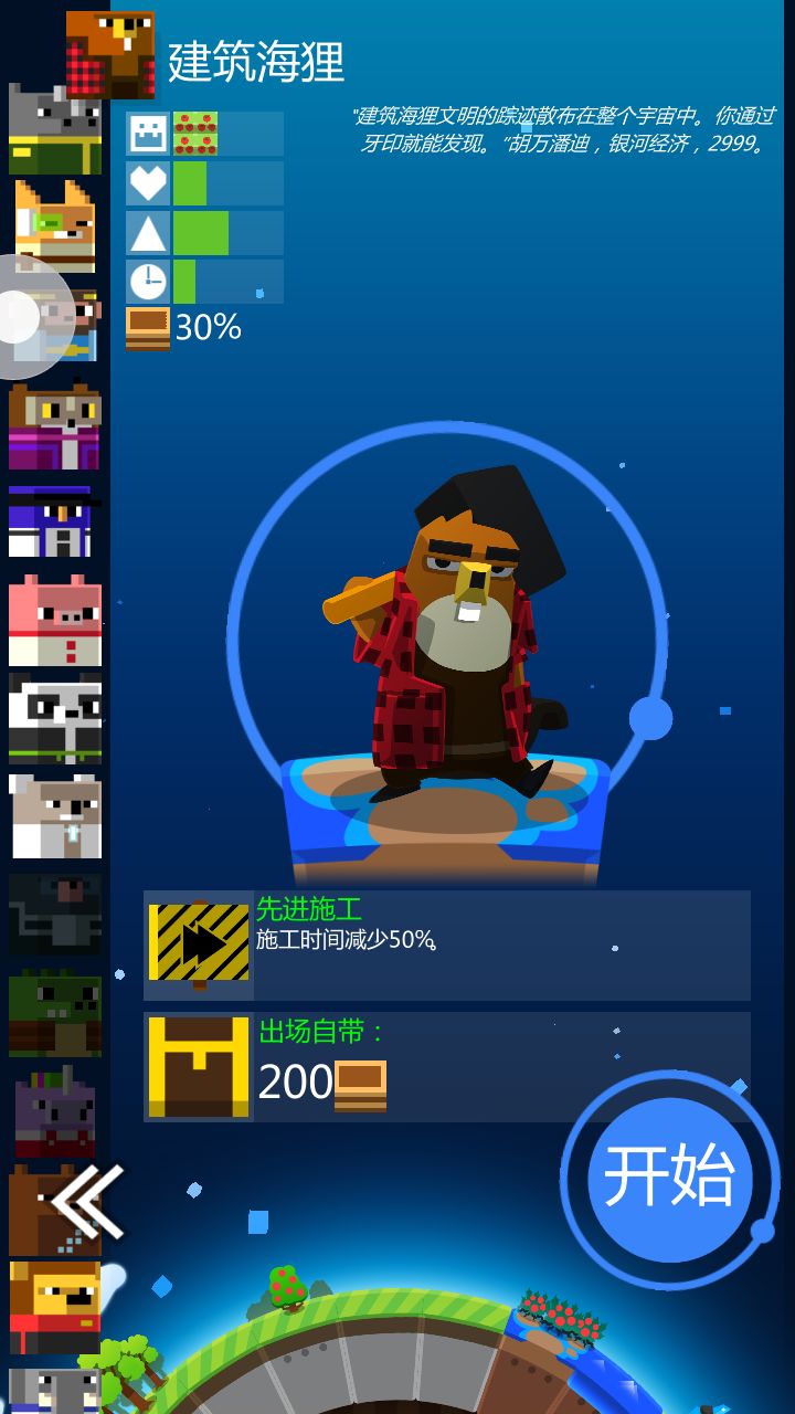 角色选择~我的选择是建筑海狸,因为建筑海狸的在生产过程中有30%的几率会产出木头,有助于中期产生大量煤炭还有纸。~~~~~~~~~~~~~~~~~~~~~~~~~~~~~~~~~~然后是开局星球,只要你的脸不黑基本是开局一棵树,一棵红果。放一个海狸在红果另外一只选个合适的地方建出一栋(一级房子),还有一个(一级果田)。然后产一个人去砍树。(不要增加人数,在等级2级前不要增加人数)然