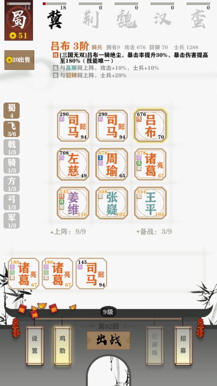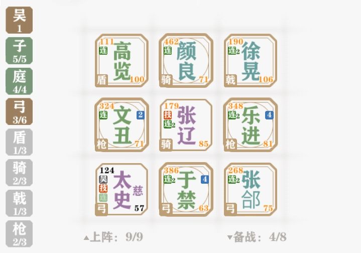 池子里已经刷不出橙卡了。基本都被我和电脑拿空了。电脑不给面子。要不就5个三阶橙了。本身是为了测试属性强度和兵种牵绊哪个优先度高,顺便凑三阶橙,慢慢发现了一个伪无限刷图法。简单,成功率高。蜀国选6飞军。无当飞军在特色兵种中是毋庸置疑的NO1.可以让我们快速攒钱的同时也能很好的保持健康的血量。充足的血量是我们后期卖血刷图的保证。飞军的自爆特性也是我们刷图的根本。首先正常依靠6飞军进入决赛圈,