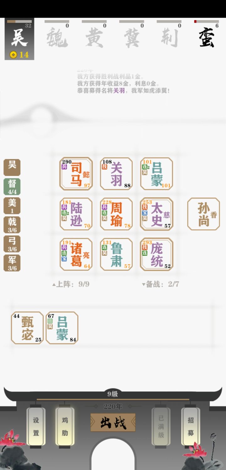 字走最无脑的阵容,别的阵容后期可能因为质量低导致输出不够的问题,这套完全不用担心,全二星都能吊打绝大多数电脑后期阵容。首先选魏国,只点魏五谋,其他全禁了,最终成型我们只要7张卡,魏五谋加诸葛庞统,什么法正鲁肃,前期当工具人凑一下六军,中后期直接卖,这样做的好处是避免追三时卡格子(即使这样依然可能会卡),因为其他七张卡都要追三,越多越强,新版有了升级机制,这套比过去更强。前期思路卖血极限升人口