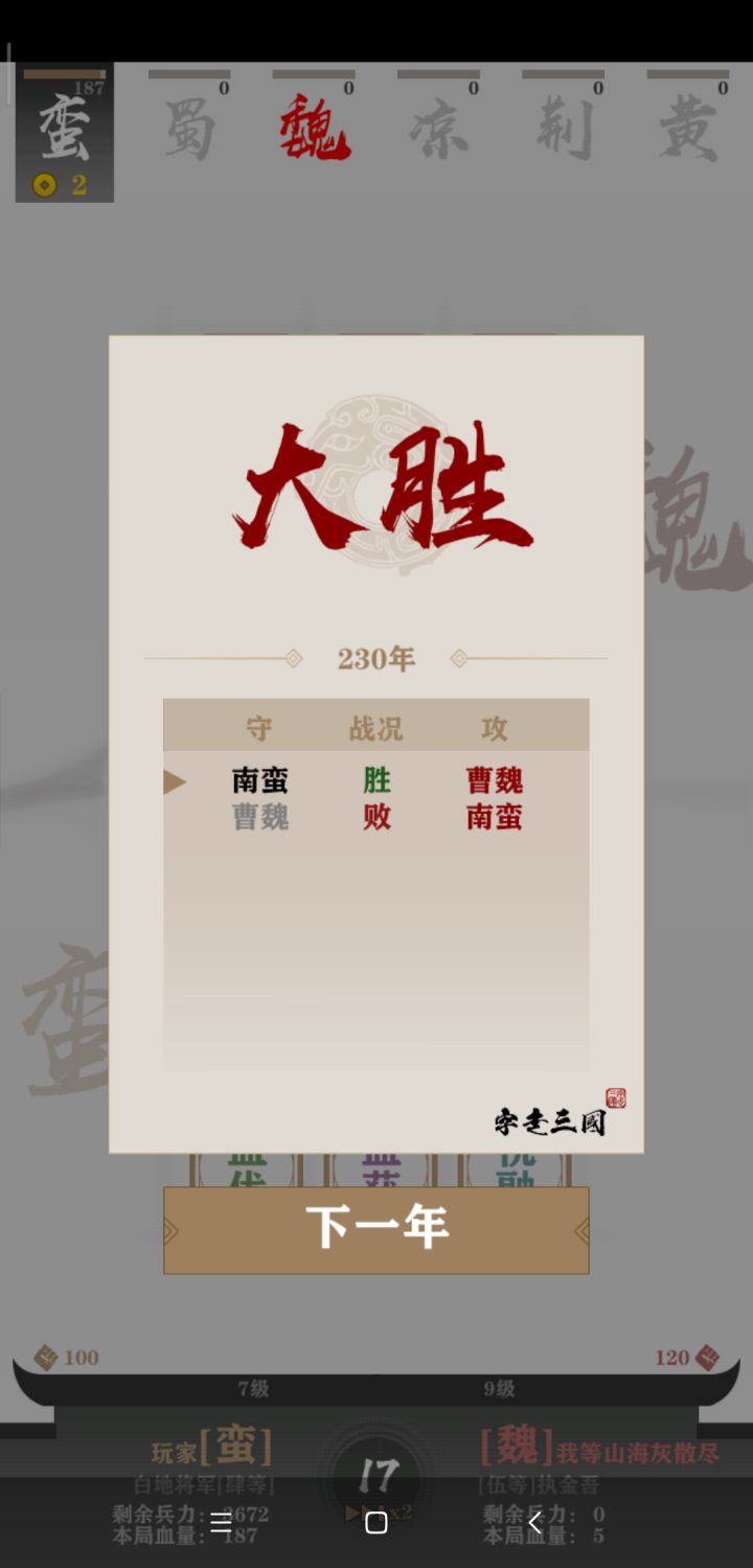 如图,7级,不满编,上阵全象,只败一次,统一前夕被关羽直接斩了金环运气比较好,3级就拿到南蛮三杰,然后全程只拿象(中途用诸葛触发了一下七擒孟获,然后就卖了诸葛腾位置)。三杰升级快,前排抗压,木鹿中间争取触发技能。孟获带着老婆和兄弟在后排打输出,因为对局势力多枪兵骑兵,防甘宁和马超。
