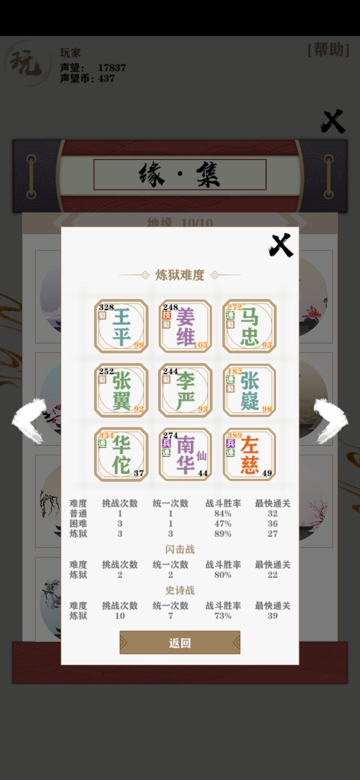 帝王史诗炼狱我的武将全部解锁,挨个试发现了最无脑的组合六无当配三术士。前中后期都不怕。其他术士过渡用只合成一次最后卖掉