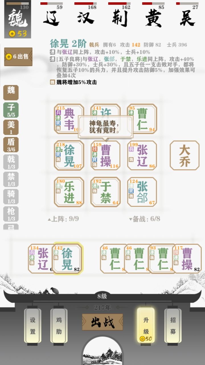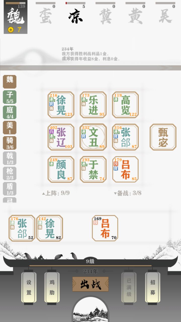 前期三盾加三虎骑加甄宓或加血量的美人(你如果三戟来得早也可以上戟但尽早还盾毕竟魏盾兵多而且有buff可以提高容错率)赢最好赢不了就以可接受的血量卖血直到凑齐四庭柱此时七人口(如果赢得多升了更多人口可以陆续上骑兵)然后凑齐五子良将就可以把三盾撤了只留四庭柱的高览 图中乐进的位置放你当前攻击最低的(图中可进放第一排只为抗一下伤害)最后虎骑是真的爽