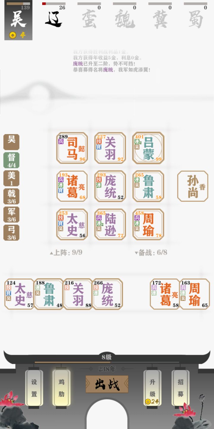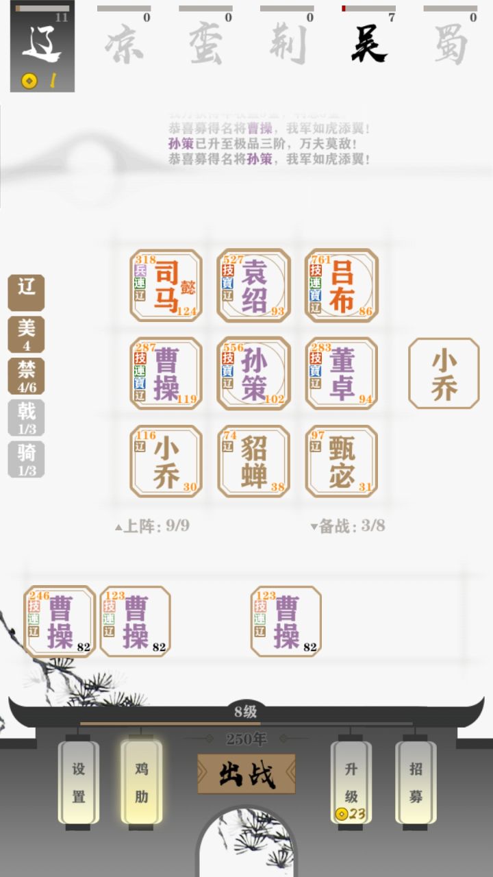 简单粗暴,坐车等人打发时间的字走棋,随时可以暂停。五子五虎四嘟嘟军师,专属组合。各种炼狱模式通关。分享两个组合黄巾六方,辽军禁卫被电脑虐了一下午,萌新先别尝试,心态会崩。基本思路就是强升民心到100。前期紫卡蓝卡过度,存核心几个武将。美女小乔必抓,其他看个人爱好。黄巾六方,卡刘备,典韦,赵云三件闪避武器给,南华,张宝,张梁。辽军禁军核心是袁绍,曹操。给袁绍卡张角天书。我这把是运气好直接给了三
