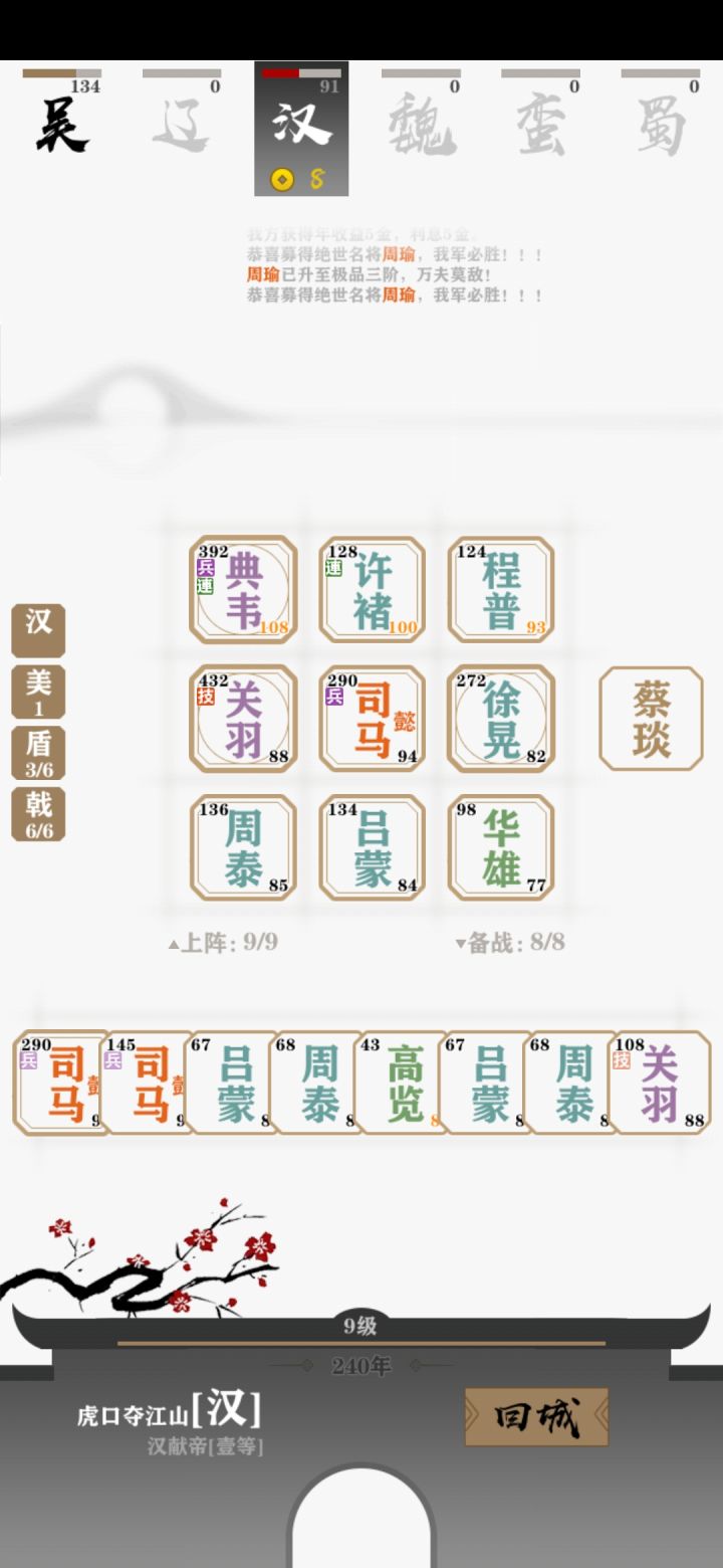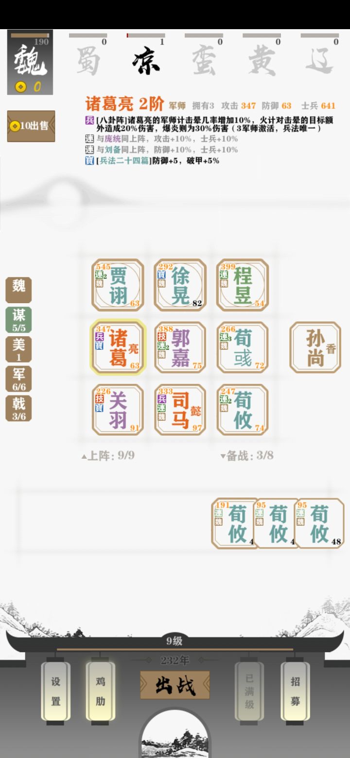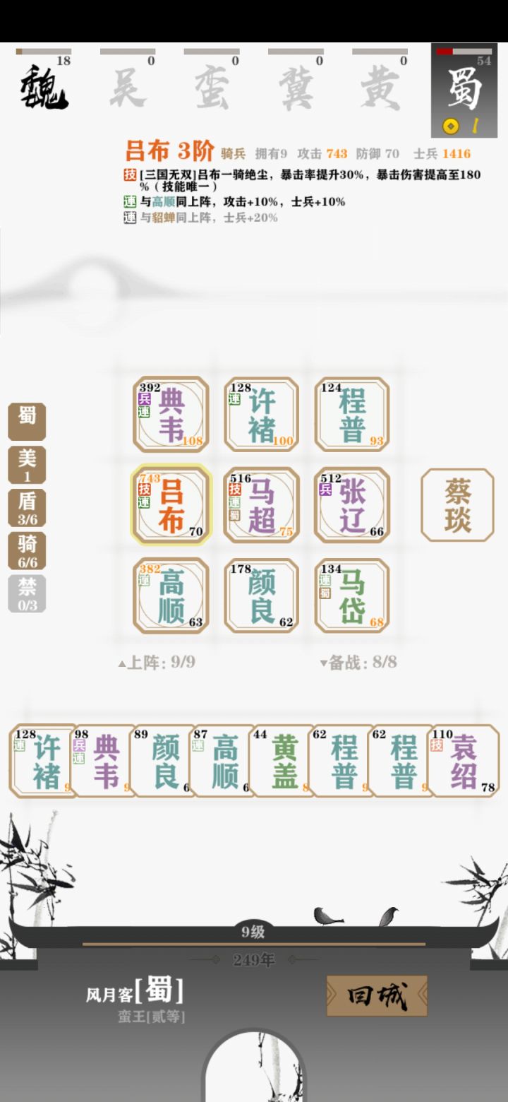 7将打9将也没问题。只要孟获升阶快,顶前面就行,最后7个蛮兵只有两个绿的是2阶,剩下全3了,也是运气比较好吧。