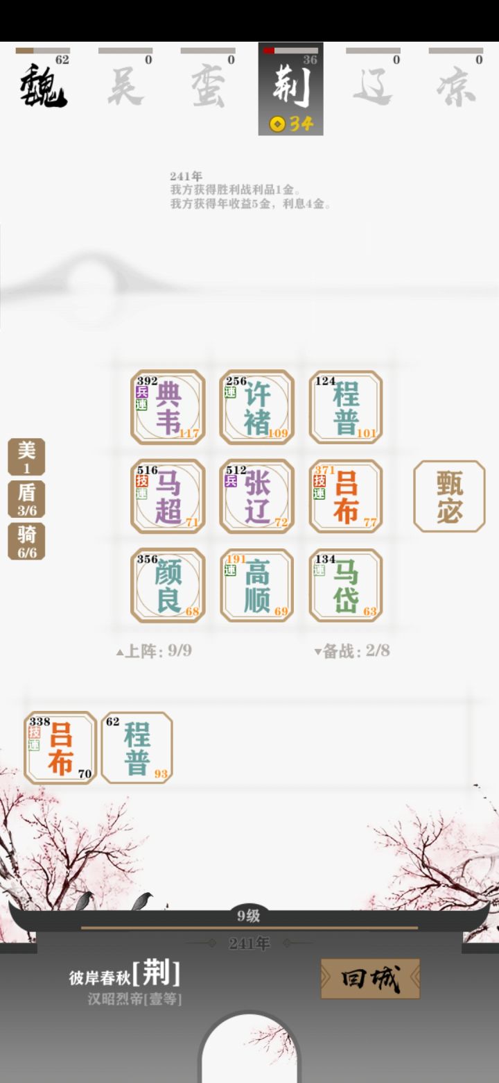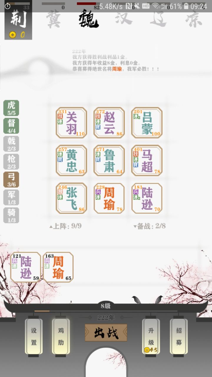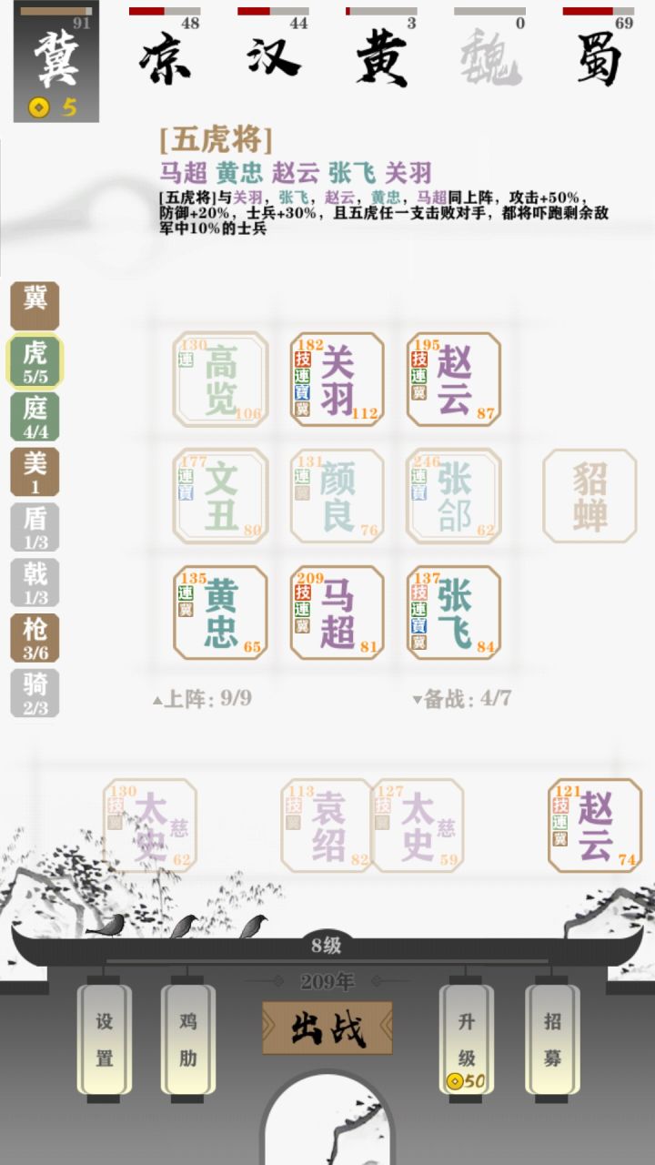 7将打9将也没问题。只要孟获升阶快,顶前面就行,最后7个蛮兵只有两个绿的是2阶,剩下全3了,也是运气比较好吧。