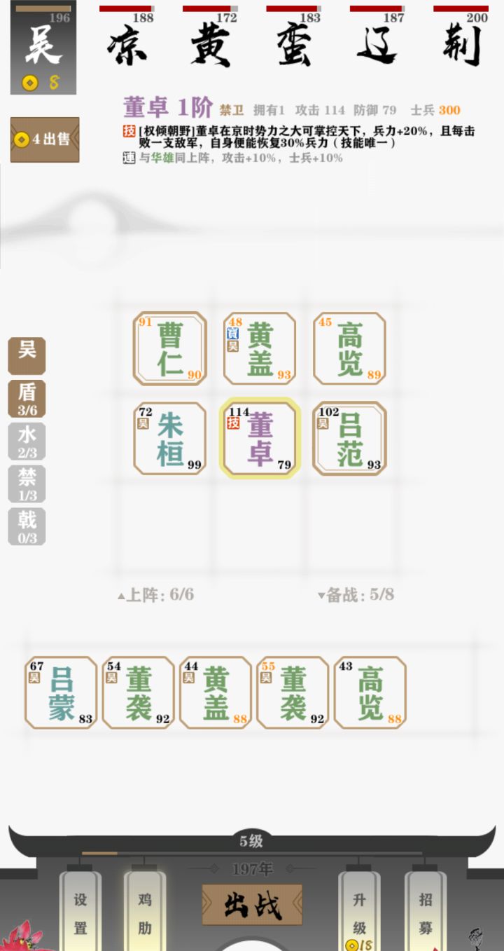 開局優先3盾,優先民心。前期優先把金幣都購入武將,若金幣清零,吃雞肋的時候容易獲得金幣。一邊收集3水軍3弓,一邊用高階替換低階臨時武將。另外防守穩固后,開始存50賺利息。每次花費留50,每局能有15金幣即開始每局刷牌。美人一張小喬,黃蓋拿武器,其他全都可以放棄。最後,集齊3水軍3弓4都督的佈局。這時刷牌應以周瑜陸抗黃蓋優先,水軍逐步3藍替代3綠。這時民心保持80以上,全力加訓練。這個配搭能從