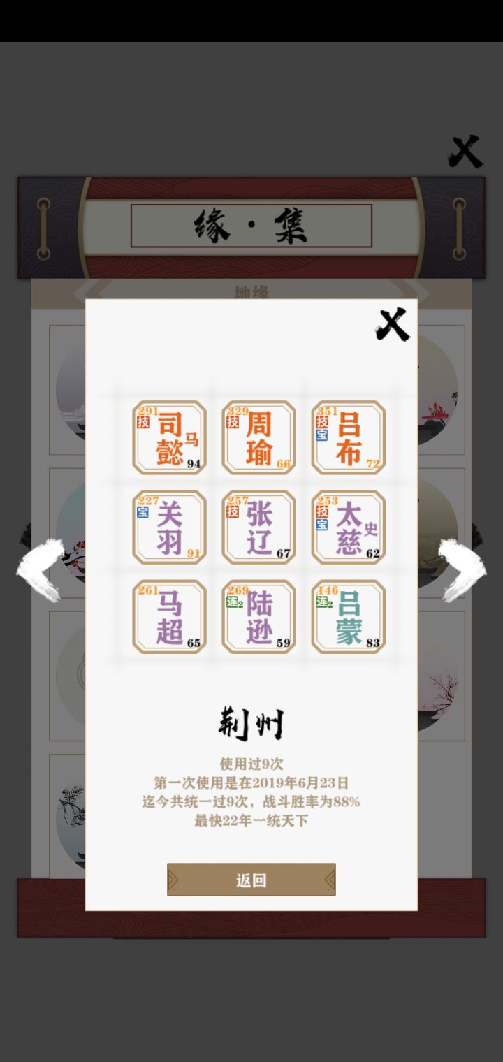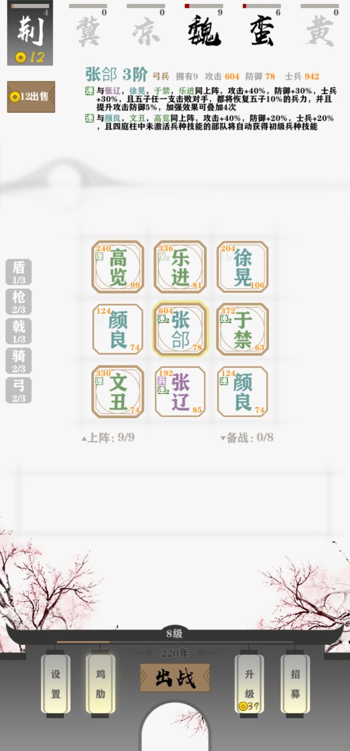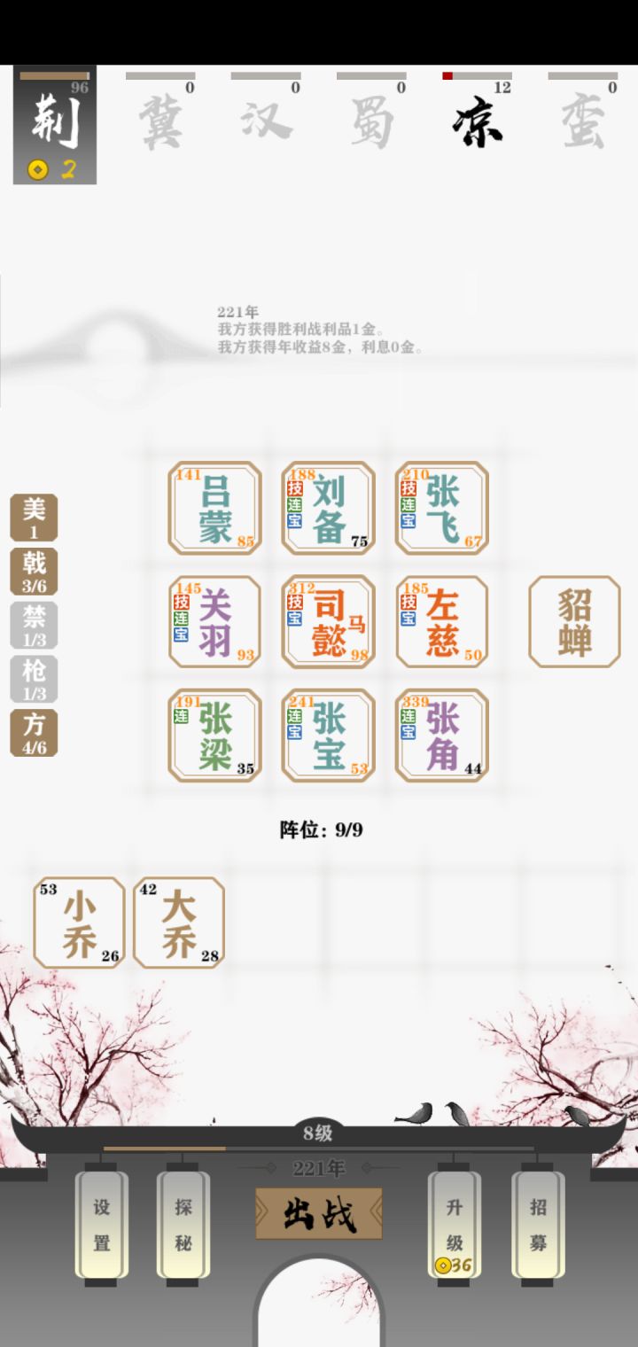 整过3阶绿卡和蓝卡,但是没什么用不如2阶紫卡,橙卡,还很占武将格子。后期为了凑2级橙卡紫卡都是不断刷新屯将。第一排条件允许可以放 诸葛亮 周瑜 吕布(2阶加宝物)第二排 太史慈 张辽 庞统 第三排 陆逊 马超 郭嘉前两排的紫卡至少要2阶才行,胜率还算可以吧。毕竟荆州不是很缺钱。还有就是图上的打法,第一排 司马懿 周瑜 吕布 ,第二排 太史慈 张辽 马超 第三排 关羽 陆逊 吕蒙 。这种