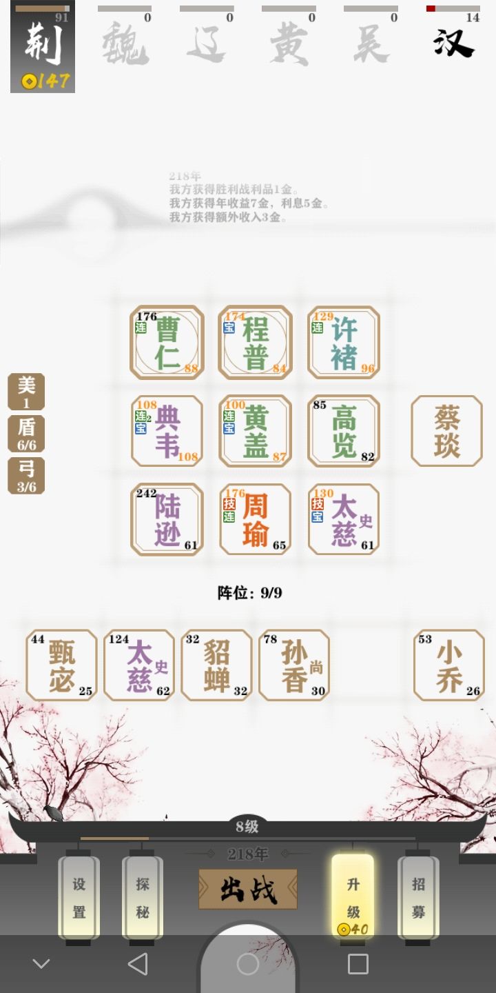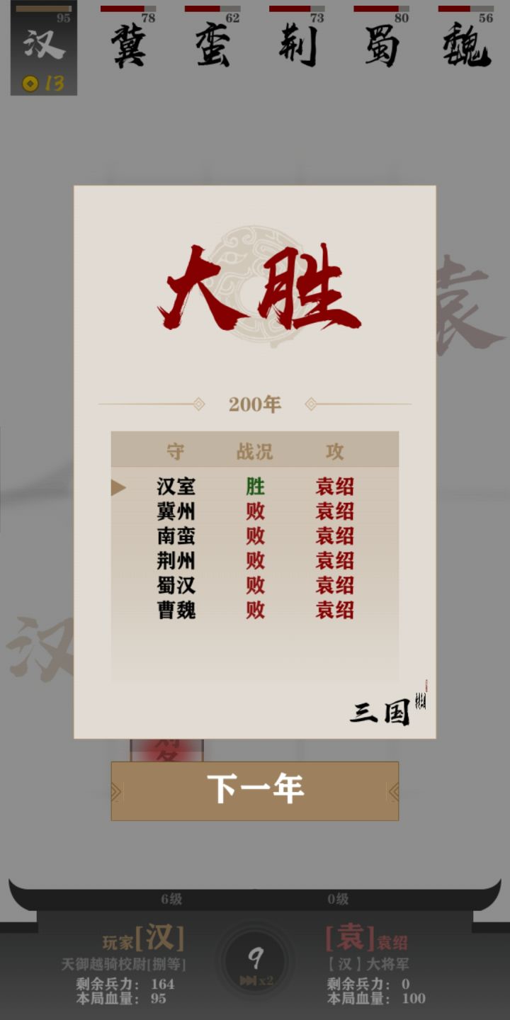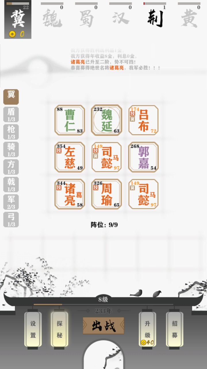 挺有趣的,简单又有策略性。一开始用的喜欢的曹公,后面发现好像蜀吴比较难一点,而且升级声望后难度貌似提升了(也可能当时没摸懂)。统一曹魏没有太大的难度,根据国家属性和将领搭配就行了。用东吴的时候看官渡之战才发现有兵种羁绊技能,尝试使用了军师+弓兵+盾兵,虽然成功了但在后面的难度里比较难实施。尤其盾兵缺厉害的将领。刚刚解锁了汉室,本来应该是很有难度的,但我尝试了现在摸索的打法。比起随机性,我还是觉
