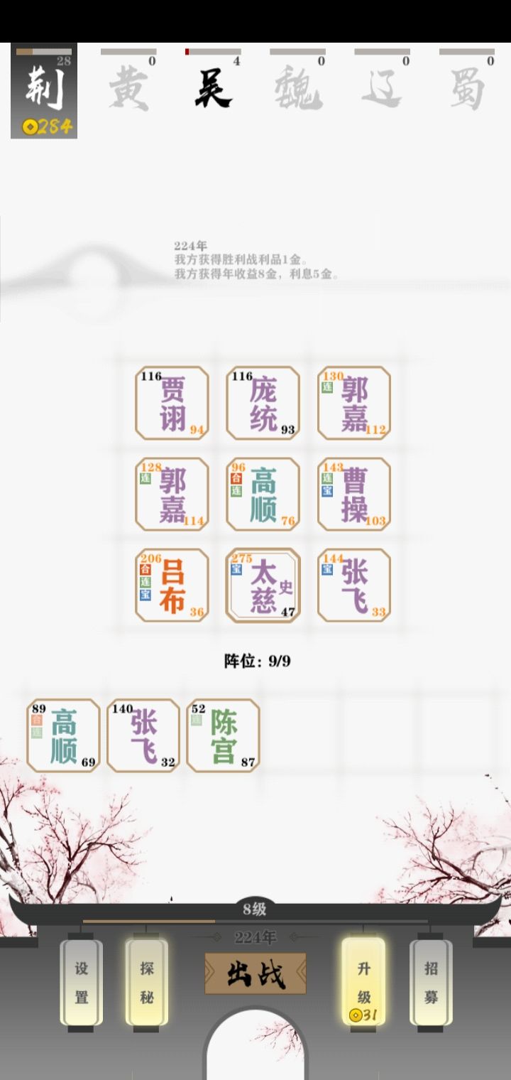 首先势力必选荆州,然后开局堆紫卡过度。难点在于要恰到好处的把握你场上的卡组总实力比较平均于对手,这样每次对手和你无论谁输谁赢,扣的血量都是比较少的(2到12之间)。存款每10金,下一年利息多1金,上限5金。每5年荆州加成给3金。然后打到这里的时候已经攒了294金了。运气不太好,周瑜一个都没出,诸葛也没能合到2级…(其实我傻哔了,没先升10级11级)。最后的阵容如下: