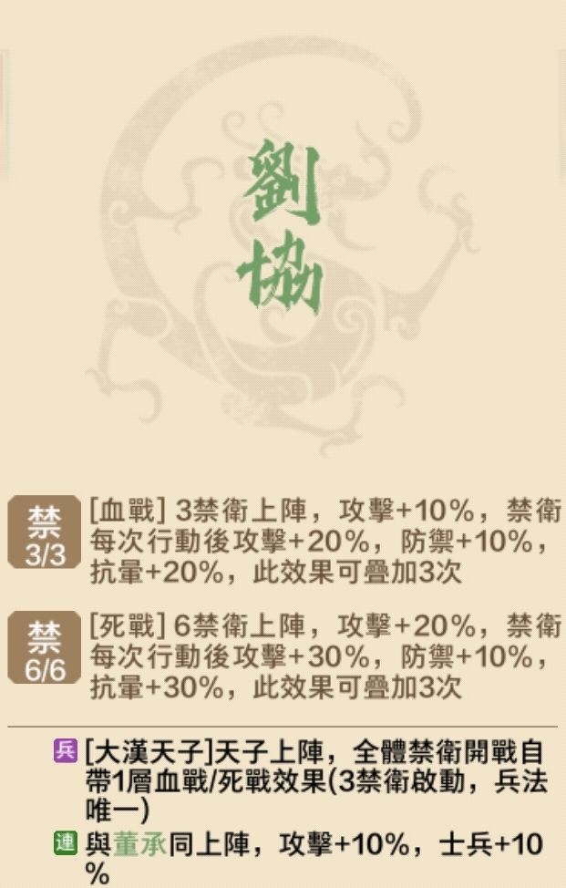 除了七神將和另外一些紫將外,還有一個不太顯眼的平民神將!今天,就讓我們來看看誰是哪名平民神將吧!劉協-小皇帝 漢室專屬綠禁儘管是綠將,卻有著最強神技:開戰時,六禁衛開局直接加30%攻,10%防,而兩輪就能疊滿,配合上三紫禁的技能,每個人都是戰神一般的存在。使用劉協,就當他是平民曹操一樣用就可以了,儘快升三。劉協六禁開局1.3攻,1.1防,基本沒啥弱點,最好用AOE/大型連攜去對抗。亦可以用