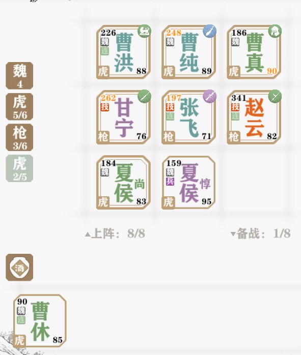 首先四嘟嘟常规,为二二五除去二二五还可搭配五虎除去以上常规其实最近我考虑了一下围绕孙权来搭配的变种阵容首先四嘟嘟+孙权+曹操+许褚+典韦+司马第二套四嘟嘟+孙权+刘备+关羽+张飞+赵云或甘宁这两套阵容的好处在于利用四嘟嘟启动桃园羁绊虎煞无命和吴下阿蒙组合武将的技能,使得几乎所有武将都有了基础技能和组合加成(但是PVP第一套实用性应该不高,第二套可以一试,有好思路欢迎分享)