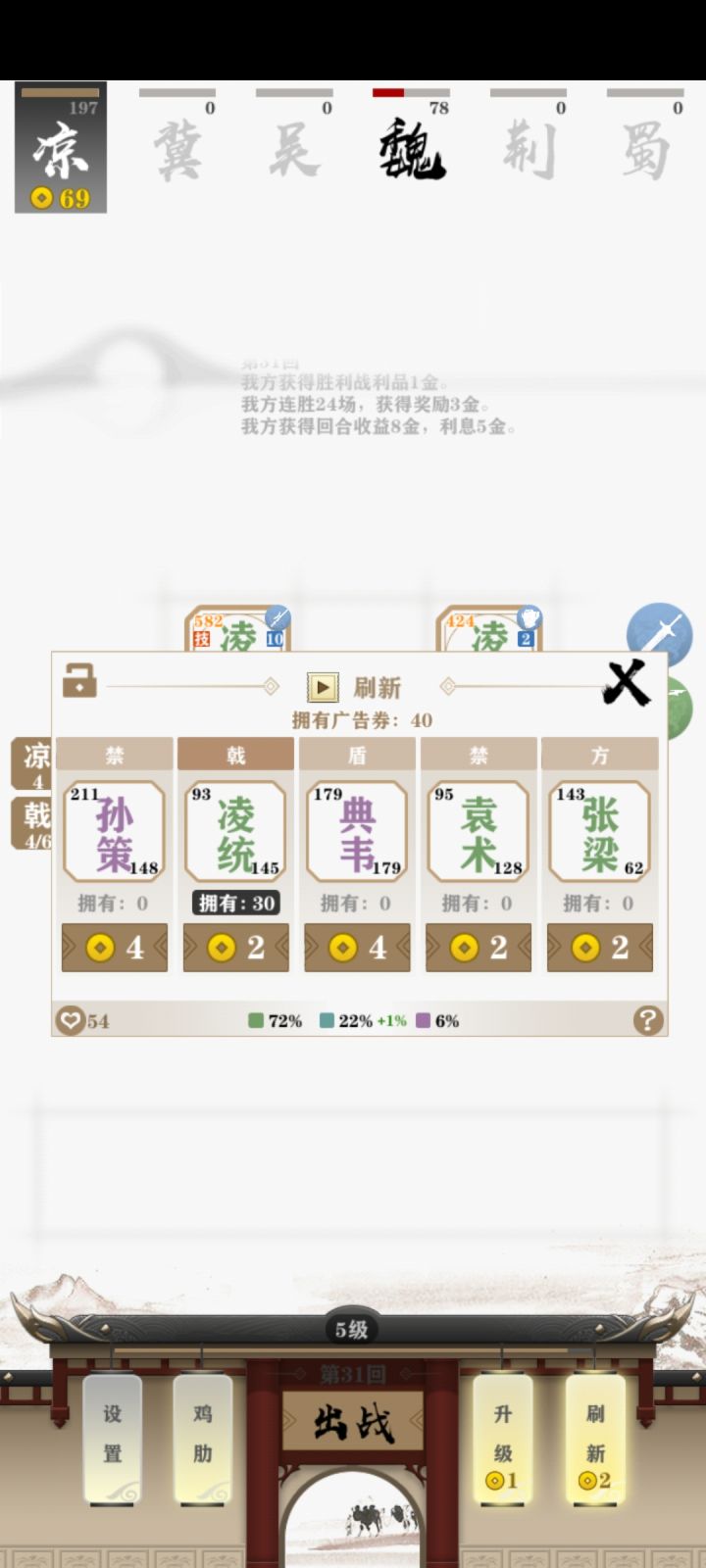 当我以为只有三十个统统的时候,我发现我错了,从开局就拿到三个统统,六回合统统就三级了,不解之缘。第一次知道原来武将升到了10级以后就不能再升了,但是会再开一个三阶分身继续升,也不知道同一个武将最高可以刷到多少个。