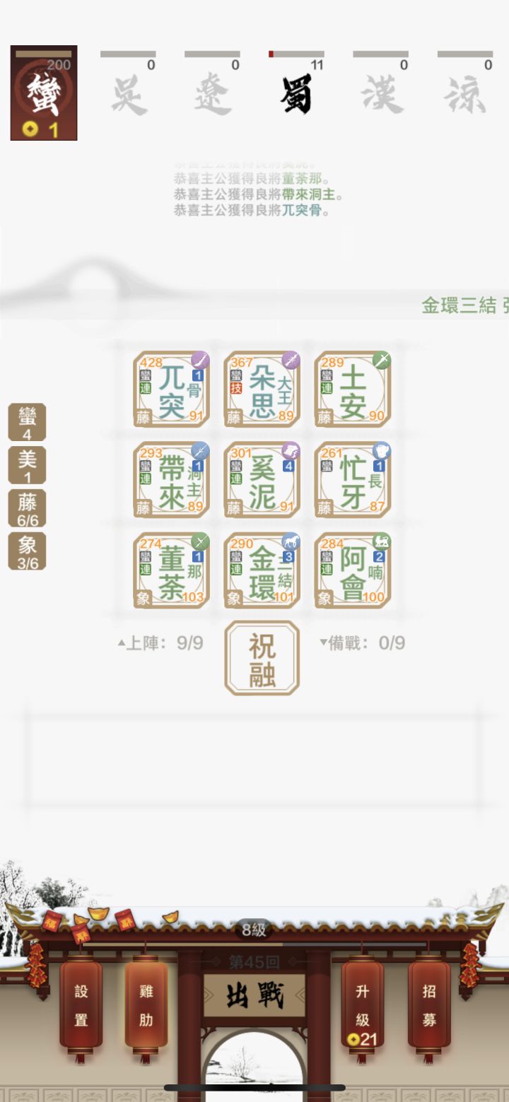 今天為了解每日任務的藤甲兵種,第一次玩藤甲兵。可能是三國殺對藤甲的印象就是被火攻火計輾壓,玩煉獄感覺電腦就會遇到六軍師燒爆,所以一直不想嘗試,今天試起來意外的順暢,中間有三回合不小心輸掉有sl ,最後結果45回合滿血連勝(順便解了滿血連勝的任務),來推廣一下。 配三象兵就是怕被燒的時候有個不被剋的撐著。減傷的部分沒有被剋制的情況下不輸盾、羽林、飛軍,攻擊的部分隨機三選一增益(額外