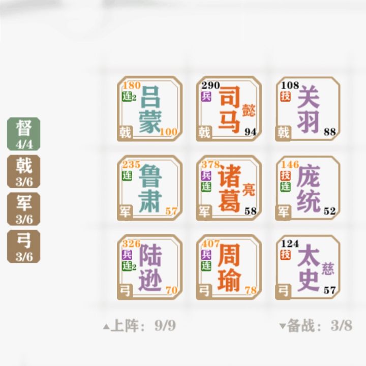 东吴四都督组合(吕蒙、鲁肃、陆逊、周瑜,三排全爆炸输出)前排配吕蒙、司马懿、关羽,戟将攻防兼备中排配鲁肃、诸葛亮、庞统【注意:军师一定要有庞统,大大加强双后排团伤】团伤加控制后排配周瑜、陆逊、太史慈,爆炸团伤教对手做人阵容总3橙将、4紫将、2蓝将,后期基本不用全升2阶就结束战斗了