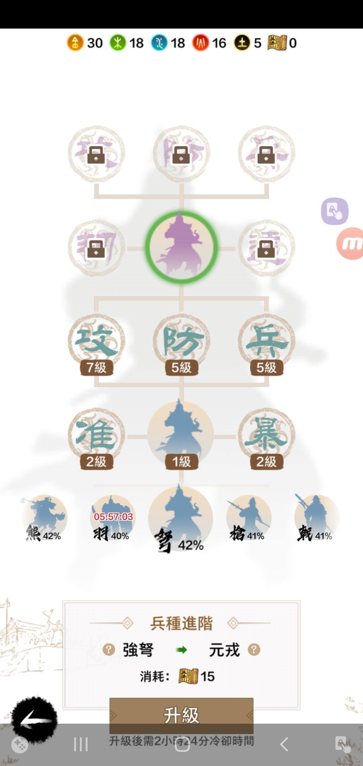 前言:鑒於下圖中的情況,藍階升紫階的費用(15兵法殘卷)。未必能全破所有任務。(下圖之例為「連弩」升「元戎」)。而我兵營剛升72級後,只有「近衛」是紫的。但6-1的NPC都已有兩個紫階兵種了!有的甚至有三至四個。這樣既難打又損肝!故此,鄙人在此提供以下小建議,敬請見諒。建議1:藍階升紫階所需之兵法殘卷數量為5,但藍階兵種必須先與NPC的紫階兵種單挑,此NPC稱為進階將軍-??(??為紫階兵種名稱