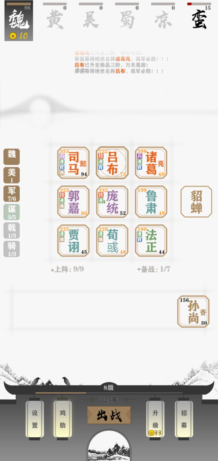 红盾——曹仁(特技:坚守——士兵数越少防御力越高)or司马(特技——坚壁:被攻击次数越多,防御力越高)红戟——关羽红枪——张飞(特技:怒喝——穿刺数加一)红禁卫——曹操独一档。然后孙权刘备二档禁卫,其他三档禁卫,体现三国鼎立,两弱一强。