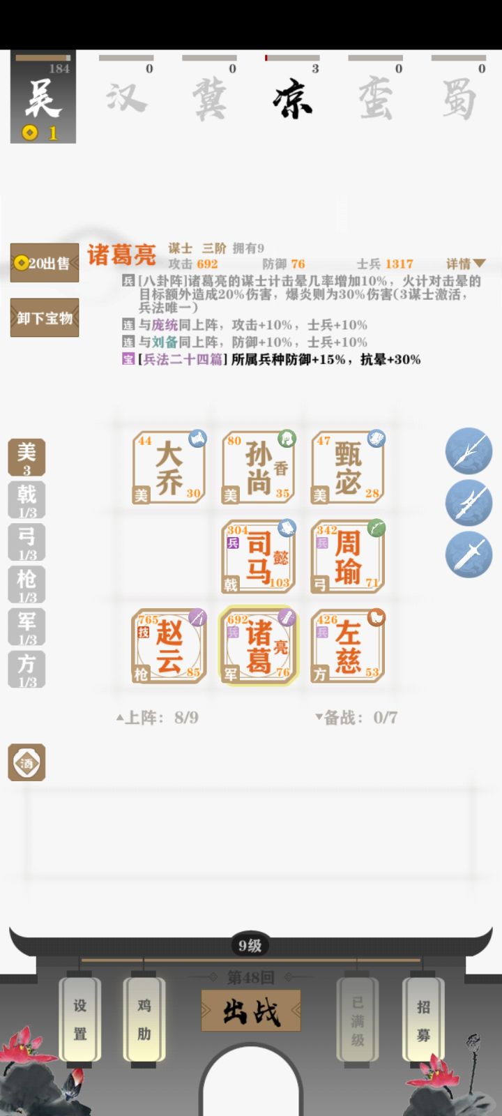 赵云诸葛左慈全部神装毕业三大美女硬抗伤害哈哈剩下的五费卡一只都不出,还是差点运气民心士气全满,(掉血为了继续抽卡)