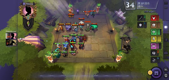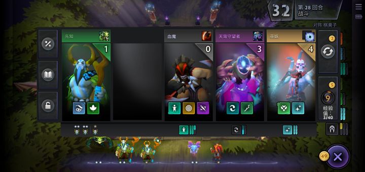 前期正常森林六法的套路,28回合来的巫妖,整体来卡比较顺利。28回合到31回合是欧皇附体的时候,3回合内龙骑2星加个1星直接出到了3星龙骑,先知也3星了,加上大树现在是3个3星。打完35回合大龙出了扩大阵容,直接把2星毒龙放上去了,这个时候手里还有50存款。这是决赛圈的阵容,没有控制打不赢6刺,这时候手上有张美杜莎,直接升人口把美杜莎放上去了。这时候手里不敢留钱直接搜卡了,美杜莎上了2星,
