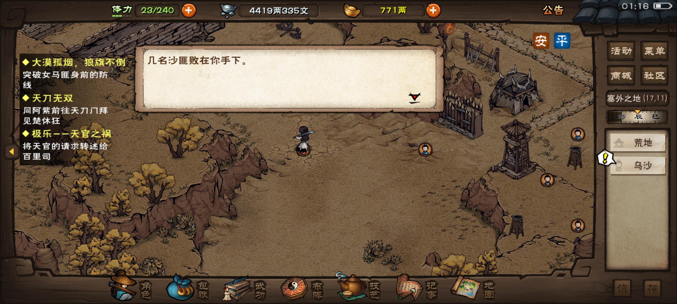 武道榜一,以下是是结合个人以及wiki的攻略总结开局三叛门:指的是开局门派选择收益最大化,流传的三叛开局此前为苍狼门-天刀门-太乙教,然后男号去少林,女号如果希望快速开荒可以选择最后落户天刀。【注意⚠️开荒期千万不要落户苍狼】叛门过程中注意,各大门派的一阶弟子无法使用本派的贡献商店,开启贡献商店需要出师第一个师父。开局苍狼,先出师到进阶师傅开启苍狼沙盘推演,快速将沙盘推演至300级,然后拿