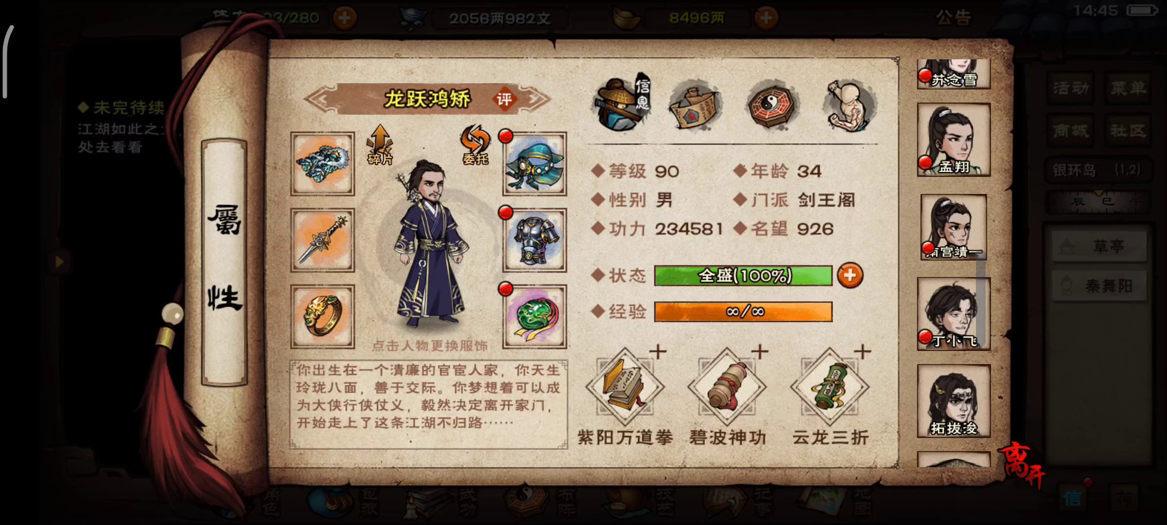 目前情况:这是我速刷了90野怪,把存的月卡体力全用了后的情况。(升了一级半)速刷90级过程还是很艰辛的,不过反复尝试机会很大。附上90速刷方法:(双控制)21天,目前是陶镇派一套,主角镇派一套,柳和钟还是上乘一套。打了6次铁刃门就给了一张太虚刀,剧情给了一张,目前两张。(运气极差)墨经24张残页我也凑齐了,每天墨子副本还是要打的,一直凑齐10个傀儡核心,就可以不打墨子副本。傀儡核心我