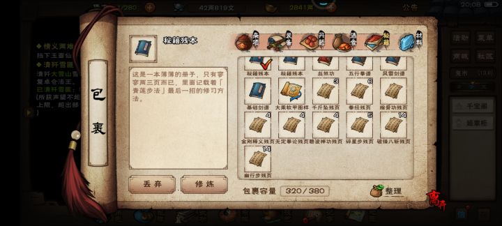目前情况:今天刚好,主角镇派套路拿满了。剩下就是等升级了,武学再往后升也非常慢,必须得慢慢熬。80级以后需要的银两,我也屯了一些,80级后基本不会太缺银两。如果明天体力不够升级,我准备把攒到体力也花掉。(周年庆送的)😅铁刃门怕是指望不上了,真就什么都不掉,天天满怀期待,天天只能在副本捡垃圾。九幽我是周日晚上打,那时候我80级,武学也升级了,说不定可以打到60层,可以多拿点阅历。