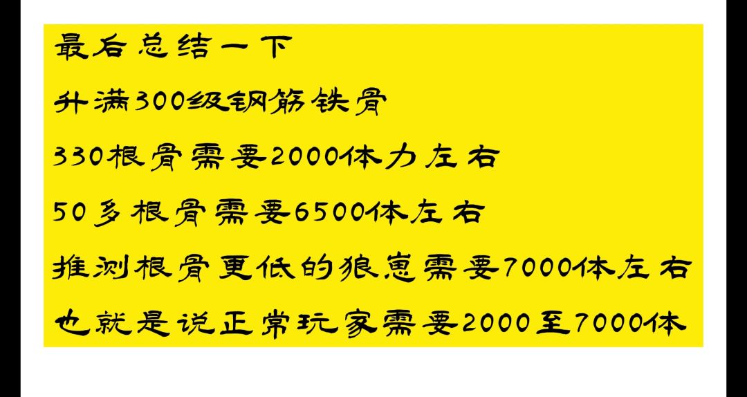 最后总结一下升满300级钢筋铁骨330根骨需要2000体力左右50多根骨需要6500体左右推测根骨更低的狼崽需要7000体左右也就是说正常玩家需要2000至7000体#图文安利大挑战#攻略#游戏推荐
