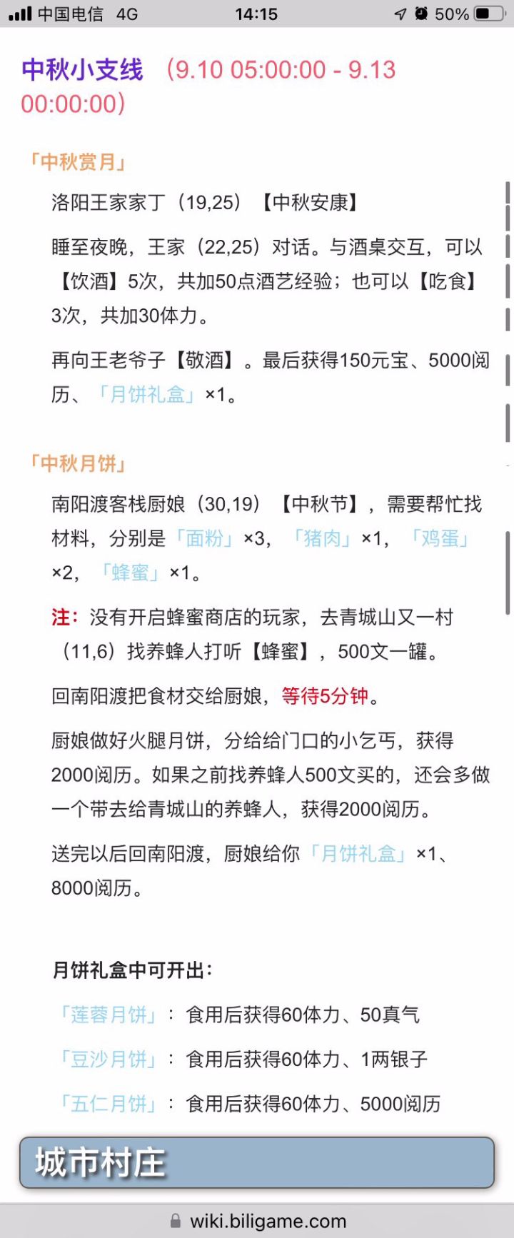 中秋月饼任务,分两个,一个洛阳王家(奖励: 150元宝,5000阅历,1月饼礼盒),一个南阳渡厨娘(奖励: 1.2万阅历,1月饼礼盒)。洛阳王家任务特别简单,点几下就完成了,而且得元宝。南阳渡厨娘任务,显得麻烦许多(可能对我图都没开几个的新人来说),也不奖励元宝,不过1.2万阅历对我新手来说实在太有吸引力了!话说如果零氪,能白嫖元宝攒一个商店伙伴吗 搬运自哔哩哔哩wiki