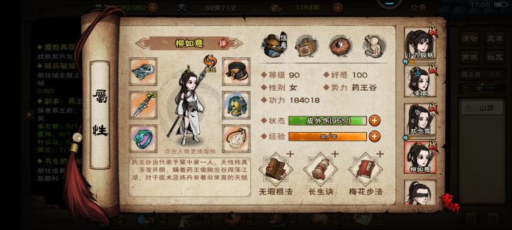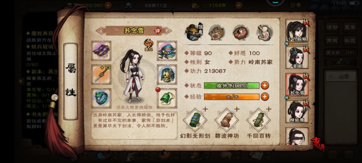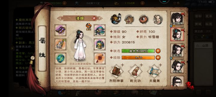 今天身上有个五百两想着去打造了四个吸血的戒指和几个装备, 主角用的是是泠月判门的武功,19岁判门 22过燕王凌烟副T 柳妹妹是主T,苏妹妹幻影碧波 然后上香弹琴嗑药打燕王 终于过了 好激动 属性图在下面 用的四方阵 83万左右 其实吸血够了就好过 供萌新参考