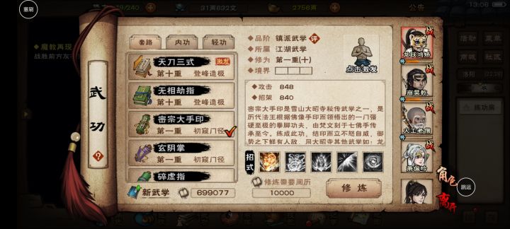 当全员镇派后,有一段时间的种草期。我个人这段时间没有太大提升,天天收菜。游戏到了瓶颈。只能开经脉,看装备序列,看脉序。但是装备和脉序都不好。装备打造几个橙武器就没什么紫金。(我是微氪,只有基金和月卡)在全员镇派以后,长时间阅历没有消耗,导致一时间阅历快200万了。(日常武馆三次,全图木头人,杭州看荷花,八卦门改运气,这些是阅历较多的几点)。这段时间大概有20天。我没有作为。再等长生诀和给柳妹妹