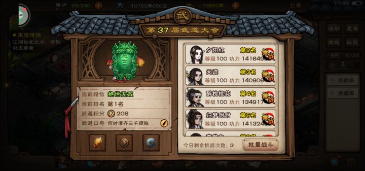 武道榜一,以下是是结合个人以及wiki的攻略总结小势力浅谈按照解锁难度以及毕业时间进行排序,尽量用最低的成本来完成小势力任务。巨鲸帮开启方式:在洛阳-扬威镖局(33,13)万青山处押镖满5次且人物≥40级即可触发特殊活计完成后向陆飞打听选择【出力相助】毕业所需好感:7000说明:在所有小势力中快速将巨鲸帮第一时间毕业,快速获得上乘内功叠浪诀以及气血秘技闻涛密卷,在初期大幅度的提升队伍实