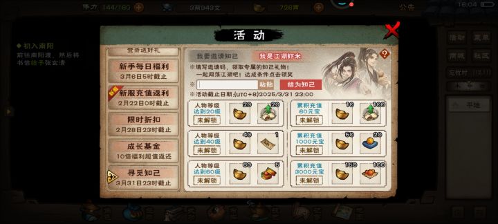 新区开局,推荐60级左右的时候(大约第10天的时候),查阅WIKI百科的支线任务,将声望刷到300点后再直接购买小筑。注意这10天里,每天的采集要弄满。小筑,需等级40级,拥有300点声望,附带耳房图纸。300点声望的时候可以去洛阳(23,17)司户令处直接购买小筑,点击家宅然后点击置办地契,按下左下角的指纹然后取个合适的名字即可成功。这时积分已经成功激活啦,洛阳(23,17)司户令处点击家