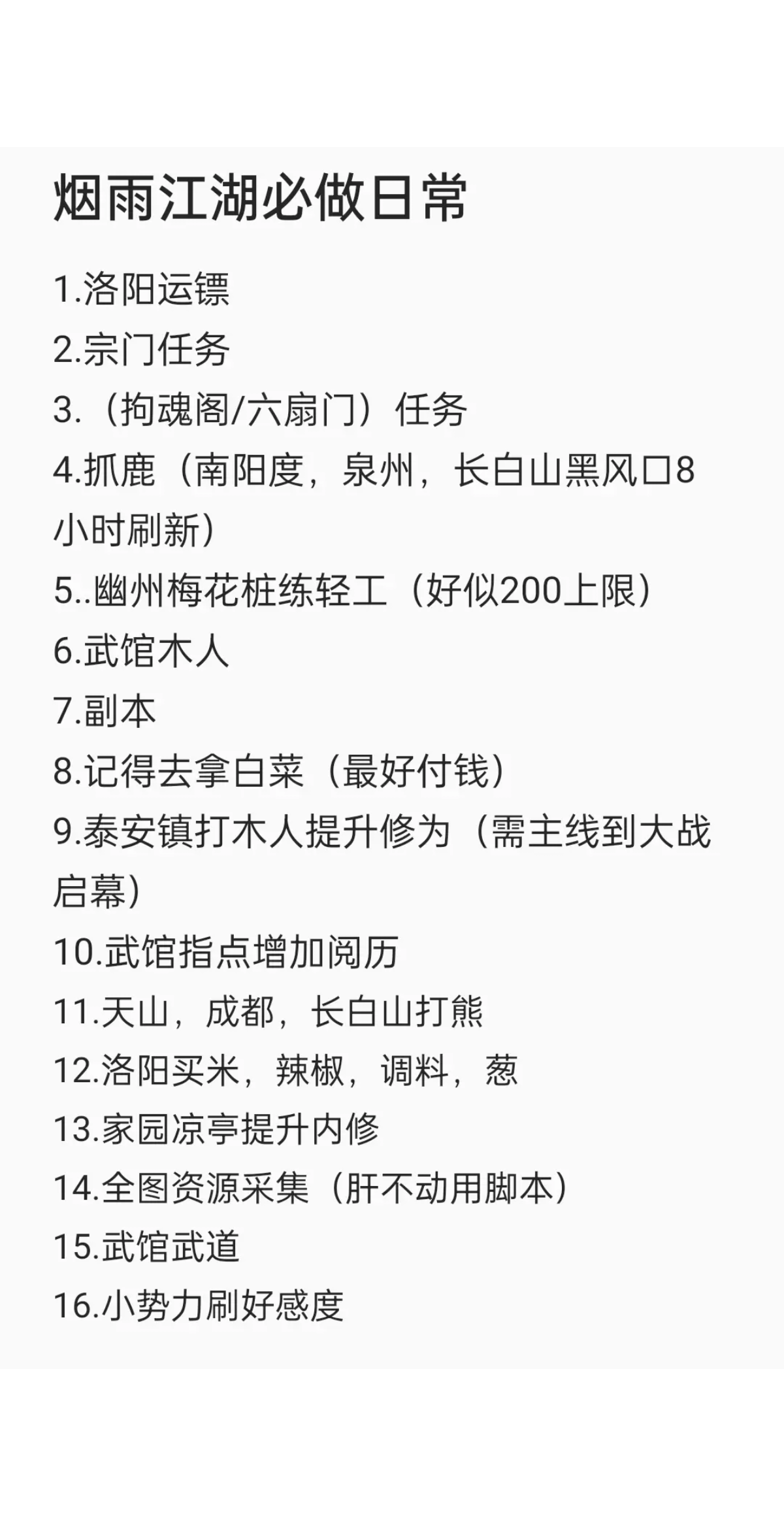 武道第一,以下是个人的一些经验: #烟雨江湖 #烟雨江湖萌新 #烟雨江湖攻略 #烟雨江湖礼包码 #烟雨江湖福利 微氪月卡玩法,先冲4个月月卡(也可考虑基金),这时候你是VIP2,可以多打一次副本,尽早的拜师,每天可以拿1000多贡献,刷比自己高级的怪,还有刷20级的怪全部用来刷蛇,因为后期要用蛇胆,40级就可以刷虎了,刷蛇和虎也不需要刷太多 ,够后期交任务就行了,到了40级就可以加入势力了,游戏