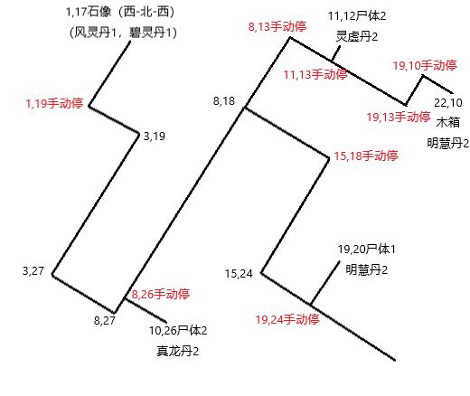 今天空下来,跟着b站大佬的视频去捡了下宝箱,发现自己操作的时候,还是有个具体的坐标更好走一些,就记录了下做了个示意图,供后来人参考。几点说明:1.图中标红色的地方手动停止(黑色坐标基本都是走到尽头会自动停止),牦牛因为有惯性,需要在前一个坐标下达指令。比如说第一个位置19,24,就需要在20,24处下达停止指令。2.提示牦牛饥饿了,不用刻意喂,转弯的时候顺便喂下就可以;特别注意19,13那一