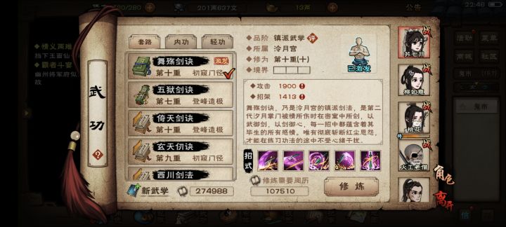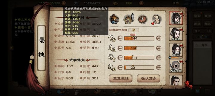 (2)主角优先升级雁行功到3级(提升跑路速度),然后根据上面的武学配置提升武学。