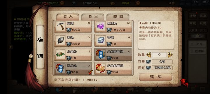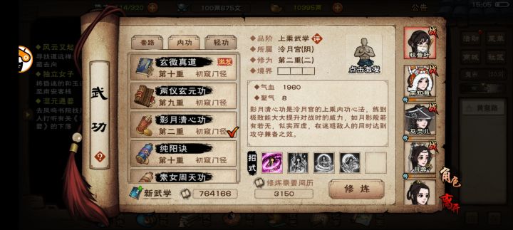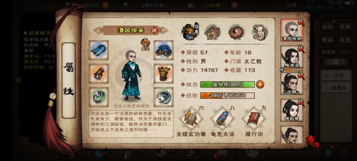 慢慢准备材料和银两,准备60级后开始全员换上乘武学了。