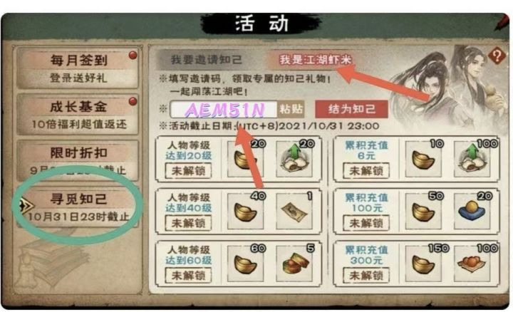 新手福利,右上角点开活动,寻觅知己,然后点开我是小虾米,输入邀请码AEM51N可获得400元宝+马车票+8万阅历+120体力+100洗髓丹+20顺脉丹。