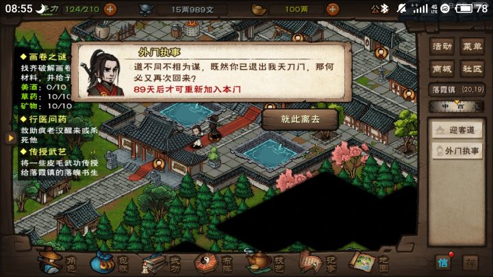 事情是这样,我本来听说可以退出门派嫖一圈功法,然后我就想退了大天刀去拘魂阁嫖,结果发现江湖势力加入不能退出……这好像还不是主要,主要是我现在去了太乙,一重两仪打完瘦道士后发现星云师父不要我🙁🙁🙁我emo了,一重两仪出师证明我实力强劲好不好,你不能看我穿着天刀的衣服(天刀的衣服确实好看)就拒绝我吧???🙃🙃🙃