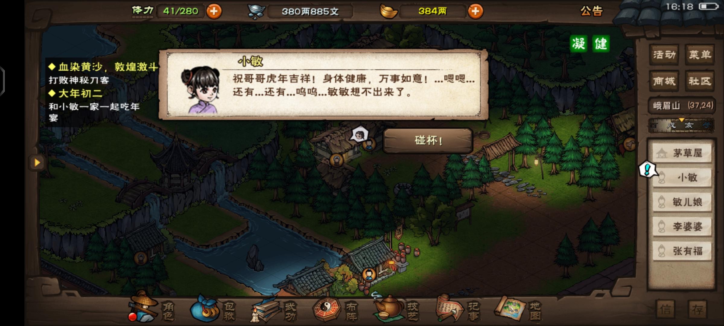 今天大年初二,公告上说的是凤鸣集小童和峨眉山小敏两个地方可以新年祝福,可是凤鸣集小童触发不了,小敏那边放烟花说的祝福语是虎年,可是今年兔年了