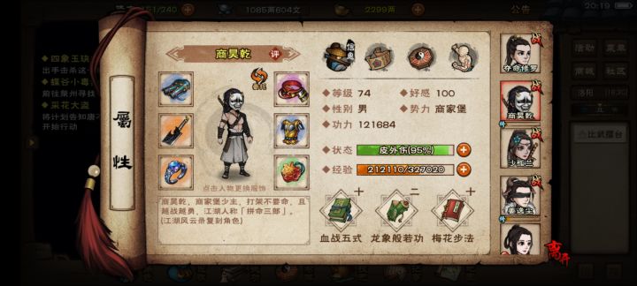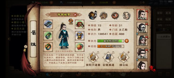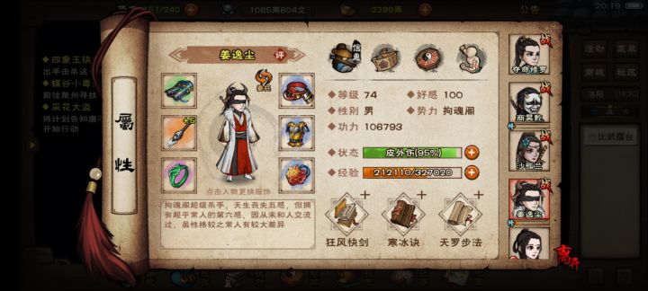 主角自家功夫不用说商,我打算过年前太虚,过年后考虑考虑寂刀(点数怎么点属性啊!!!)轻功还不知道(迷茫了)沙,搞伏羲刀,内功还不知道(我70级好像只能搞到离火和龙象)(但我听他们说离火很腊鸡)轻功不知道(提提建议吧)姜,马上幻影,2月西子,内功玄冥,轻功不知道(给给建议吧)阅历我有600万应该不成问题