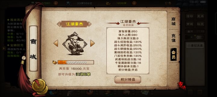 邀请码ACKSIS游戏类型:比较纯正的武侠类小游戏,后期不算肝,半年后几乎收菜为主。游戏画风是比较喜欢的国风。而且最近更新了本游戏算中上水准(更新极其慢,是缺点)1、本游戏需要氪,最少收菜之前需要月卡,月卡+每周末6元购买奖励最好(选择马车票和门派贡献卷)。0冲不是不行,因为月卡有自动战斗,0冲会耗费非常多的时间,而且自动战斗条件满足后,打怪会比较轻松。2、本游戏可以手机玩,平板玩,