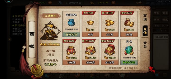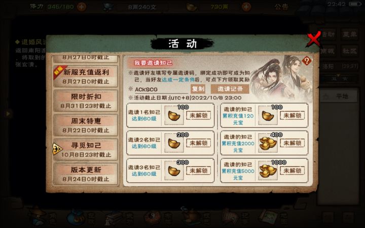 11,开局没有填知己码,少了一大堆资源,右上角点活动,点寻觅知己,选择我是江湖虾米,填入AB16M6,点击结为知己,可领大量元宝,阅历,和一个可以七天随便全图跑的马车票