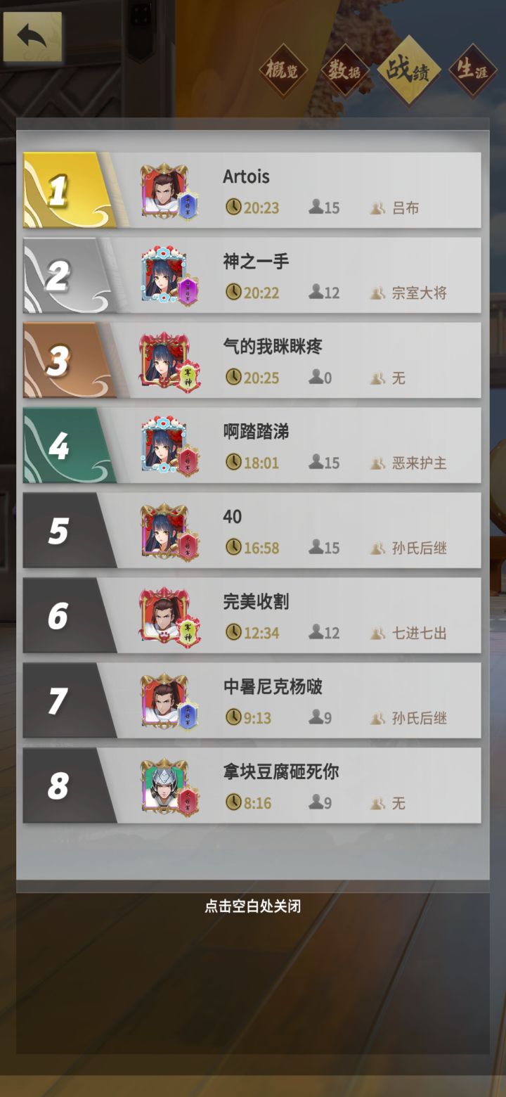 今天玩了一把 又涨见识了我是第四 但是第三名和我打 是第三名先死了 我还有8滴血 游戏结束了 给了第四名 但是我还能上英雄好像是第四名把武将全卖了你看他的游戏时长 比第一第二名还长我说排行榜上这些人都怎么上分这么快的 玩bug有一手的赶紧给老子改吊排位玩你嘛 卡得要死 bug一堆 艹