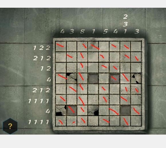 这个关终于过了。根据水面上的小纸片提示。规律大概就是一个数独的玩法。比如 8那一列,就是说这一列8个砖块都是按下去的。231,说明这一列的砖块是 2个 3个 1个 的规律去按。就是要行和列 都要按照数字标记的来。