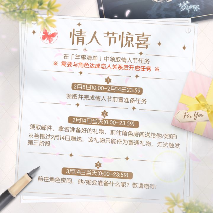 浪漫的情人节即将到来,小伙伴们有没有准备好,和ta度过美妙的一天呢。特别给大家带来了情人节惊喜活动~来看看ta会给你什么惊喜吧!情人节任务说明:Ps:记得要在【年事清单】中领取并完成情人节前置准备任务哦(需要和角色为恋人关系开启任务)