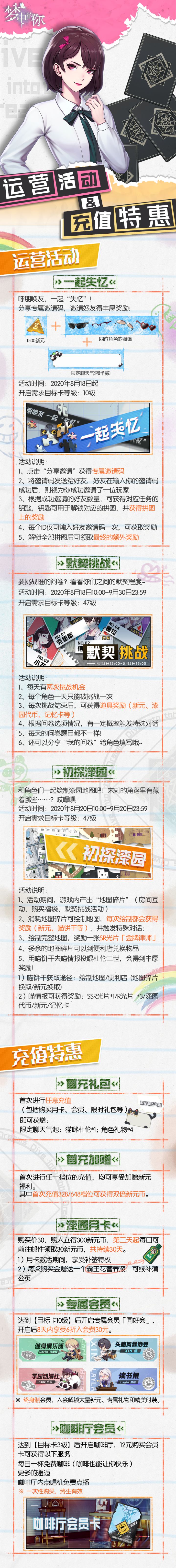 亲爱的玩家们:《梦中的你》于7月20日-26日进行了相遇测试(不删档计费),测试期间我们收到很多建议和反馈,目前已对部分内容进行了调整。现将关于测试的奖励和内容调整补偿公告如下,参与测试的朋友们可于8月18日早10点正式上线后,前往邮件领取测试奖励及调整补偿,强调一下,邮件有效期为30天~别忘记领取哦!相遇测试奖励注:因测试开启问题,注册时间临时改变为7月20日-21日,故奖励条件由【签到满