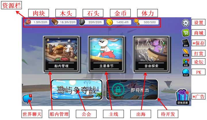 介绍完游戏的背景话不多说直接正题——游戏页面介绍相信很多新船长一开始对于界面都十分困惑经常迷路(说的是我)但熟悉了以后用得无比丝滑所以有必要介绍一下游戏的相关页面!一、主界面:包含以下部分(上方→右侧→下方顺序):1、资源栏:显示资源上限与现量情况a.肉块:战斗地图内所需消耗的体力(通常地图越大所需体力越多)b.木头:升级船员房间、超人卡的材料c.石头:升级船等级、各资源上